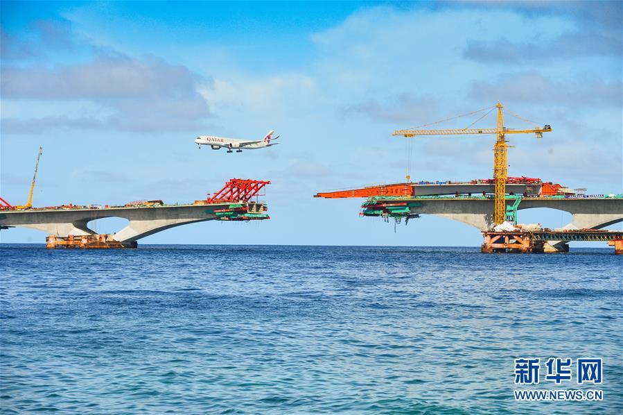 随着中国在马尔代夫援建的中马友谊大桥主桥20号墩至21号墩之间的钢箱梁7月9日成功合龙,大桥至此全线贯通,建设工作取得关键性进展。这是6月24日,位于马尔代夫的中马友谊大桥主桥20号墩至21号墩之间的钢箱梁正在顶推的资料照片。 新华社发(杜才良摄)