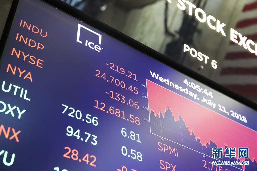 7月11日,美国纽约证券交易所的电子屏显示当天的市场行情。纽约股市三大股指11日收盘下跌。新华社记者王迎 摄