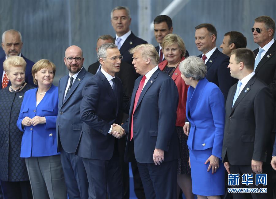 7月11日,在比利时布鲁塞尔北约总部,北约秘书长斯托尔滕贝格(中左)与美国总统特朗普(中右)在北约峰会开幕式上握手。新华社记者叶平凡 摄