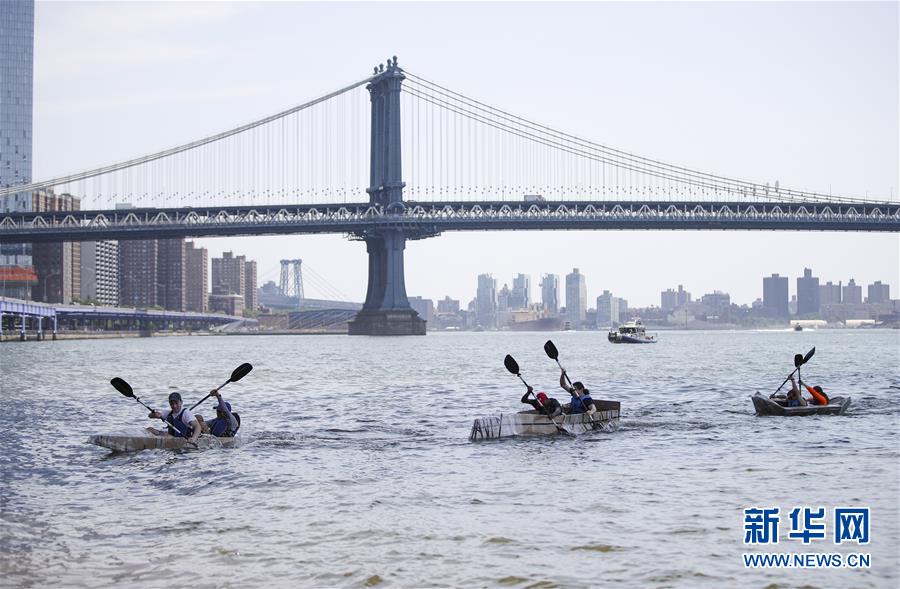 7月14日,在美国纽约布鲁克林大桥下的水面上,人们参加纸船比赛。当天,一场别开生面的“赛纸船”活动在纽约举行,选手们在规定时间内现场制作纸船并下水竞速,感受亲水的快乐。 新华社记者 王迎 摄