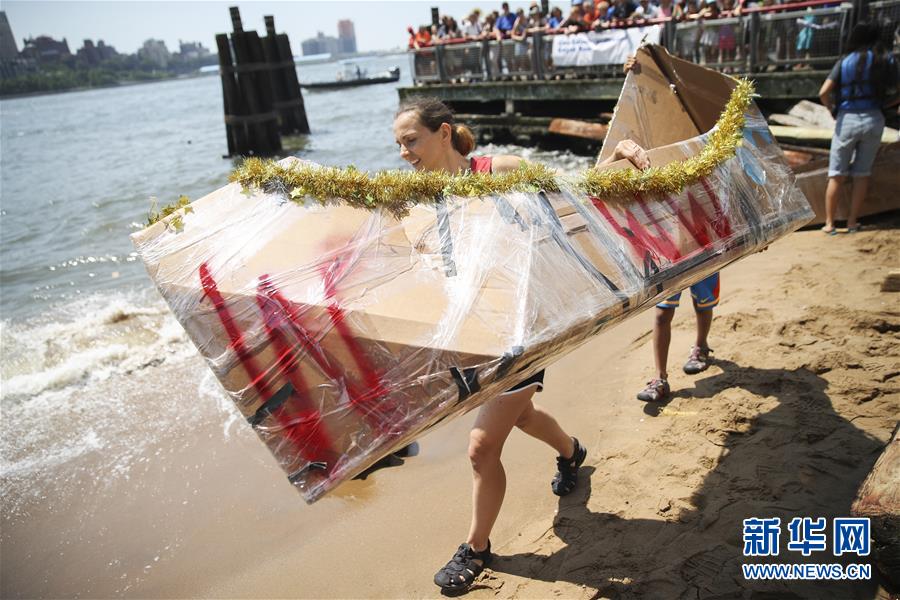 7月14日,在美国纽约布鲁克林大桥下的水面上,人们搬运纸船准备参加比赛。当天,一场别开生面的“赛纸船”活动在纽约举行,选手们在规定时间内现场制作纸船并下水竞速,感受亲水的快乐。 新华社记者 王迎 摄