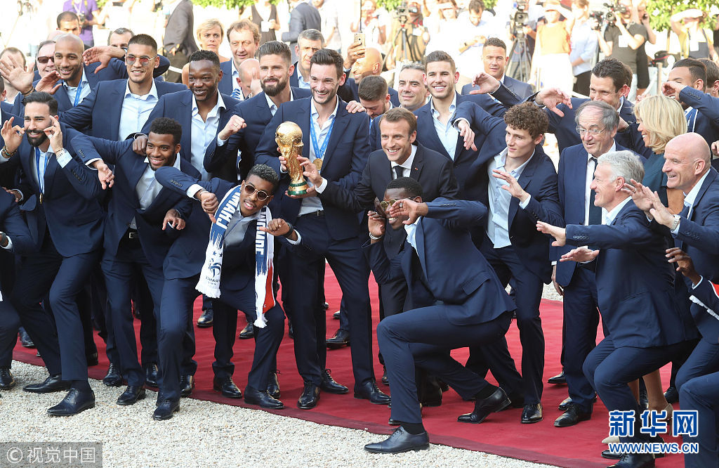 马克龙爱丽舍宫接见夺冠法国队 与队员共捧杯欢庆