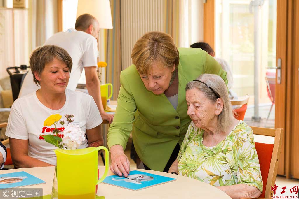 当地时间2018年7月16日,德国帕德博恩,德国总理默克尔履行其竞选时对St. Johannisstift疗养院一名护士的承诺,亲自造访该疗养院,了解疗养院运营情况,并与疗养院的老人亲切互动。