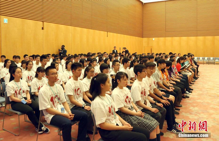 7月17日,日本首相安倍晋三在东京首相官邸会见由约200名中日青少年组成的“小大使”一行并致辞表示,希望两国青少年成为日中友好的桥梁。图为参加活动中日青少年。中新社记者 吕少威 摄
