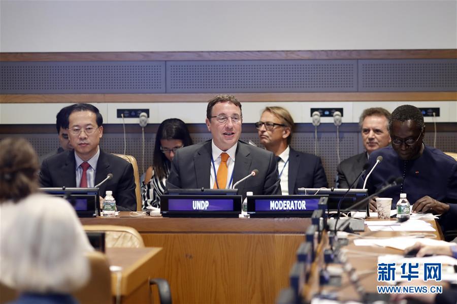 7月16日,在位于纽约的联合国总部,联合国开发计划署署长施泰纳(中)在“应对不平衡不充分发展,实现可持续发展目标”高级别会议上讲话。 新华社记者李木子摄