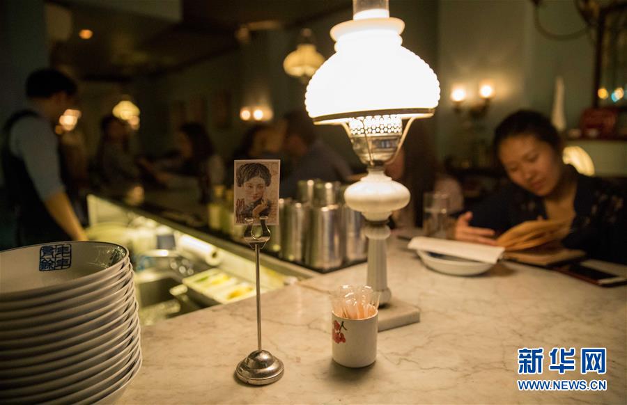 这是在位于美国纽约的“倾城”餐厅拍摄的吧台和精心设计的餐厅名片(6月27日摄)。新华社记者 王迎 摄