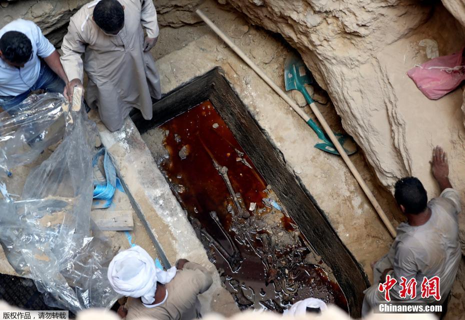 埃及考古人员开启新发现的巨型石棺 出土三具木乃伊