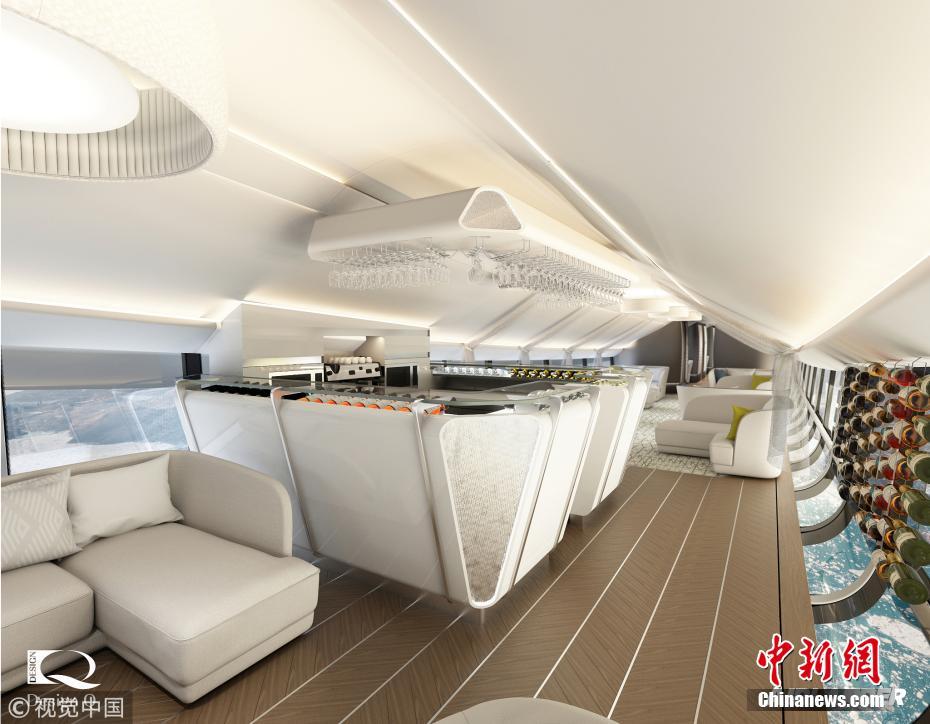 作为全球最大的飞行器,Airlander 10曾引起多方关注。在近日召开的范堡罗国际航空航天展览会上,它的制造者英国混合航空飞行器公司首次公开透露了该机舱内部的装饰设计。Airlander 10由英国设计公司Design Q设计,客舱长度为46米,要比大多数单通道飞机的客舱大很多。在长达3天的奢华旅行中,能够容纳19名乘客和船员。其内部设计包括含浴室的私人卧室、带落地窗的休息室、能够提供全方位的可视角度,此外还有供乘客享用饮品和美食的高空酒吧。Airlander 10由四台325马力的涡轮增压柴油发动机驱动,并由类似机翼装置提供40%的空气动力,氦气可以使其在空中保持飞行。此外,它可以携带重达10吨的有效载荷,载人情况下能在空中停留连续五天,不需要专门设计的跑道。 图片来源:视觉中国