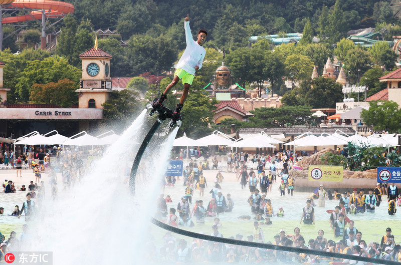 当地时间2018年7月20日,韩国龙仁市,水上飞板表演者在加勒比海湾做出各种炫酷的动作。韩国全国持续多日高温,首尔最高气温升至34摄氏度。图片来源:东方IC