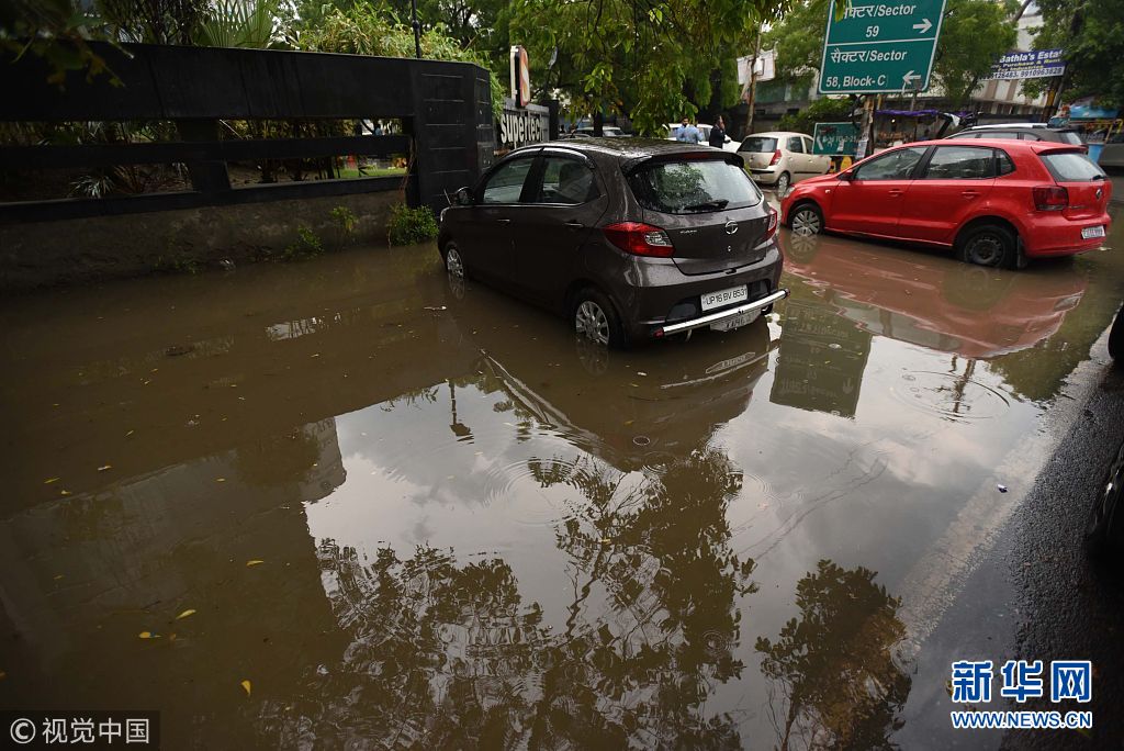 当地时间2018年7月21日,印度诺伊达,由于连日暴雨,道路出现积水影响民众出行。(图片来源:视觉中国)
