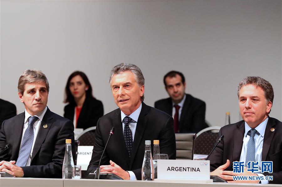 7月22日,在阿根廷首都布宜诺斯艾利斯,阿根廷总统马克里(中)、阿根廷央行行长路易斯·卡普托(左)和阿根廷财政部长尼古拉斯·杜霍夫内出席二十国集团财长和央行行长会议。