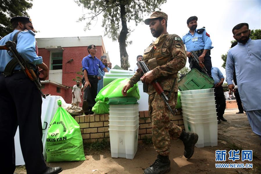 7月24日,在巴基斯坦伊斯兰堡,安全人员看守选举用材料。巴基斯坦将于7月25日举行大选,同时选举国民议会和省议会,并在此基础上组建中央和地方政府。新华社发 艾哈迈德·卡迈勒 摄