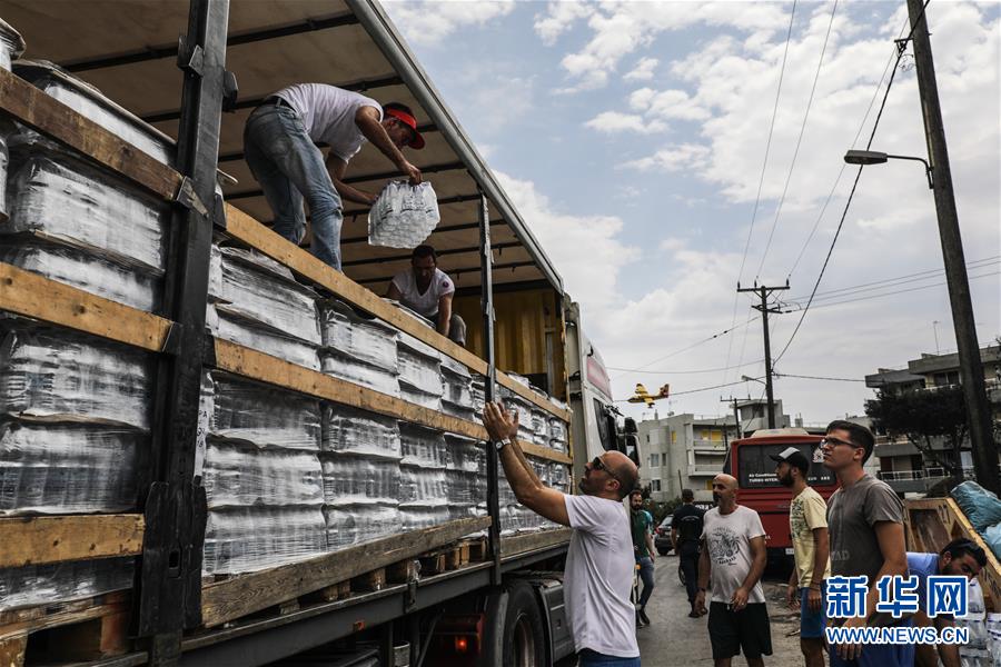 7月24日,志愿者在希腊首都雅典附近的马蒂小镇发放瓶装水。