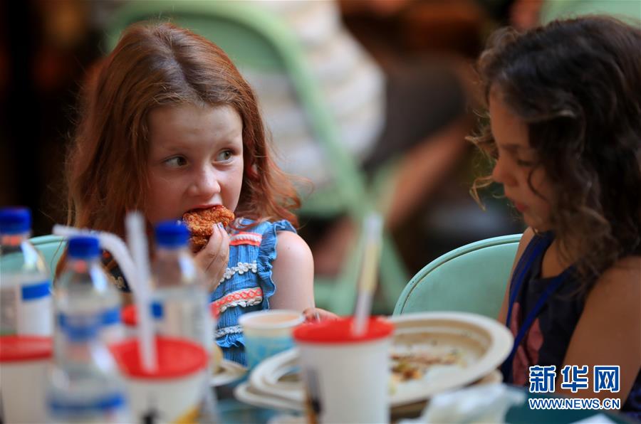 7月24日,在美国洛杉矶农夫市场,两名女孩享受美食。