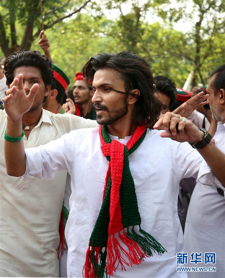 7月26日,在巴基斯坦伊斯兰堡,支持者在正义运动党领导人伊姆兰·汗的宅邸附近庆祝。 巴基斯坦选举委员会27日公布的初步计票结果显示,在25日举行的国民议会(议会下院)选举中,正义运动党已获得110个席位,以较大优势领先其他党派。 新华社发(艾哈迈德·卡迈勒 摄)