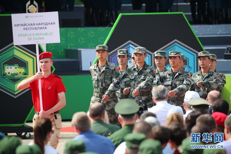 7月28日,在俄罗斯首都莫斯科郊外的阿拉比诺,中国队参赛代表在“国际军事比赛-2018”开幕式上入场。