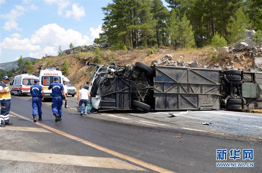 这是7月29日在土耳其南部安塔利亚省阿克塞基镇拍摄的车祸现场。 据中国驻土耳其大使馆和驻伊兹密尔总领馆消息,当地时间29日10时左右,一辆载有中国游客的大巴在土耳其南部安塔利亚省发生车祸,造成车上包括31名中国游客在内的33人不同程度受伤。据了解,该旅游大巴当时从安塔利亚省省会安塔利亚市区前往土中部旅游景点卡帕多奇亚,在该省阿克塞基镇与迎面驶来的两辆车相撞并侧翻。 新华社发
