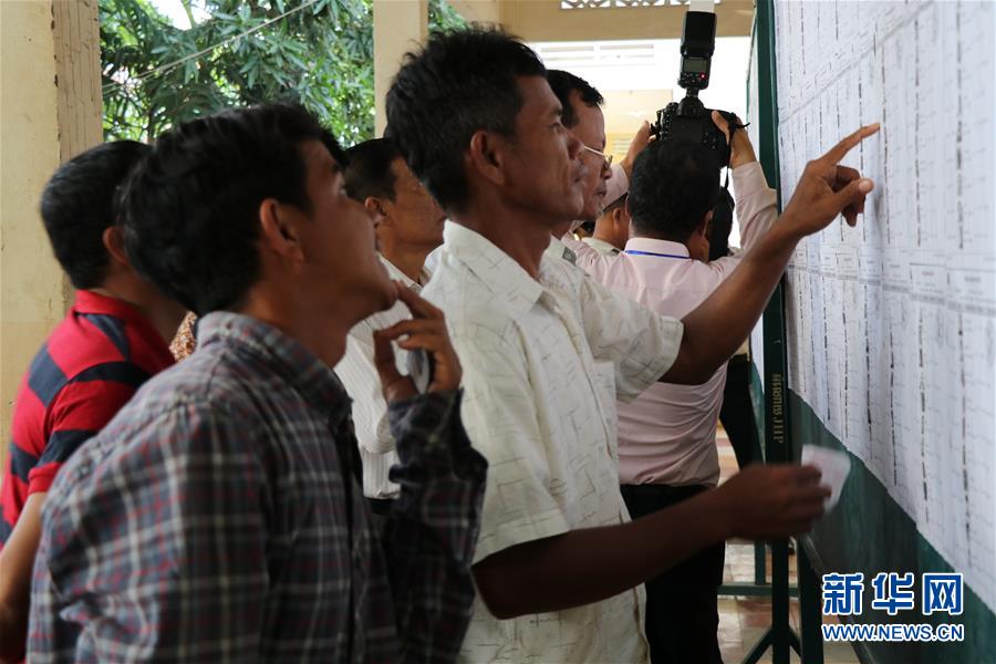 7月29日,在柬埔寨干丹省,选民在投票站查看选民名单。 柬埔寨第六届国会选举投票于当地时间29日上午7时在全国开始,将于下午3时结束。本次选举共有柬埔寨人民党、民主联盟党、奉辛比克党、基层民主党等20个政党参加竞选,角逐国会125个席位,获多数席位的政党将负责组建新一届王国政府。 新华社记者毛鹏飞摄