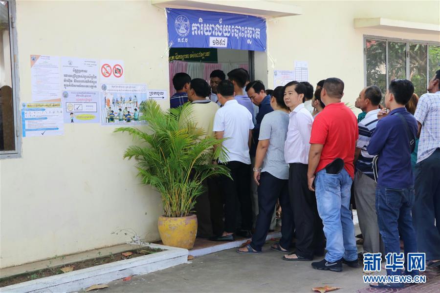 7月29日,在柬埔寨干丹省,选民在投票站排队等待投票。 柬埔寨第六届国会选举投票于当地时间29日上午7时在全国开始,将于下午3时结束。本次选举共有柬埔寨人民党、民主联盟党、奉辛比克党、基层民主党等20个政党参加竞选,角逐国会125个席位,获多数席位的政党将负责组建新一届王国政府。 新华社记者毛鹏飞摄