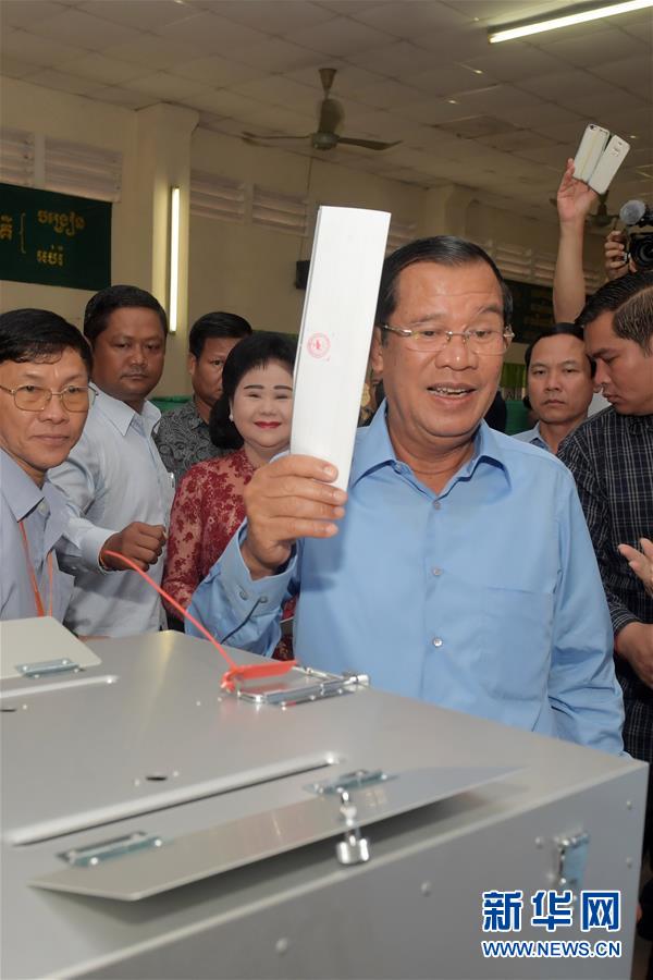 7月29日,在柬埔寨干丹省,柬埔寨首相洪森在投票站投票。 柬埔寨第六届国会选举投票于当地时间29日上午7时在全国开始,将于下午3时结束。本次选举共有柬埔寨人民党、民主联盟党、奉辛比克党、基层民主党等20个政党参加竞选,角逐国会125个席位,获多数席位的政党将负责组建新一届王国政府。 新华社发
