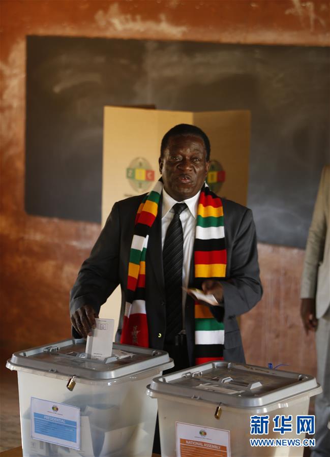 7月30日,在津巴布韦奎奎市,总统姆南加古瓦在一处投票站参加投票。 津巴布韦30日举行大选。 新华社发(肖恩·朱萨 摄)