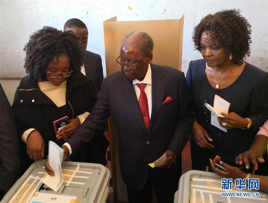 7月30日,在津巴布韦首都哈拉雷,津巴布韦前总统穆加贝(中)在一处投票站参加投票。 新华社记者 张玉亮 摄