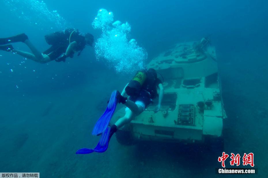 当地时间7月29日, 黎巴嫩西顿,潜水员们在被沉到海底的坦克附近作业。黎巴嫩军队捐赠了六辆旧坦克和另外四辆军用车辆,将它们沉到海底作为人造礁石,形成有利于珊瑚礁生长和繁殖的人造栖息地。人造礁石的建设旨在恢复西顿海岸附近的海洋生态,并吸引游客和潜水爱好者。