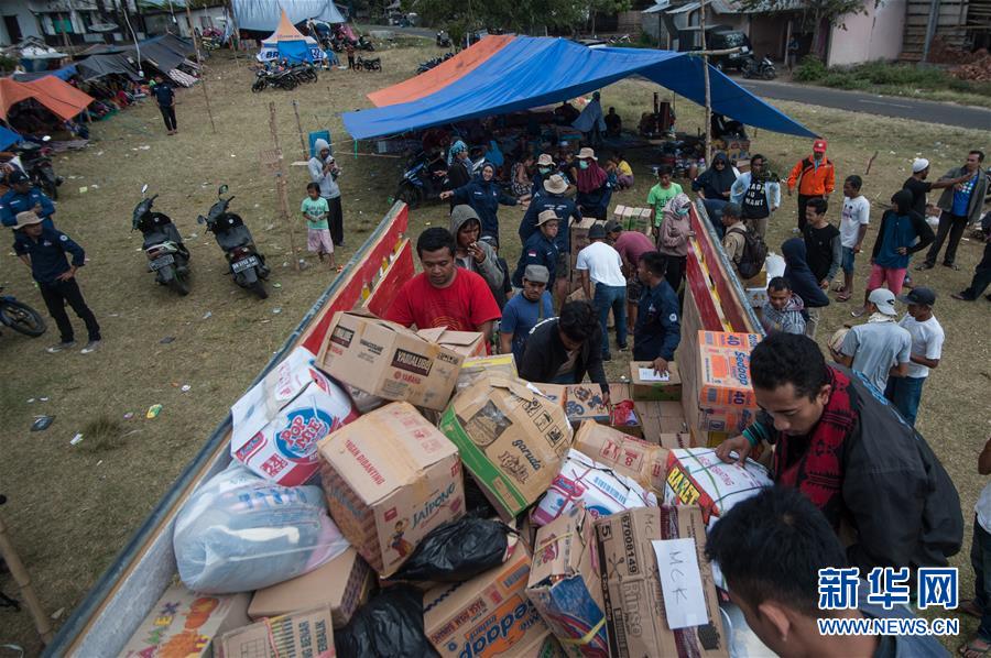 7月31日,在印度尼西亚龙目岛,志愿者分发救援物资。 龙目岛29日发生6.4级地震。印尼抗灾署公布的数据显示,截至31日早上,地震已造成16人死亡、228人重伤、127人轻伤、1454座建筑物损毁,5141名当地居民被撤离。 新华社发(维里·萨诺弗里摄)
