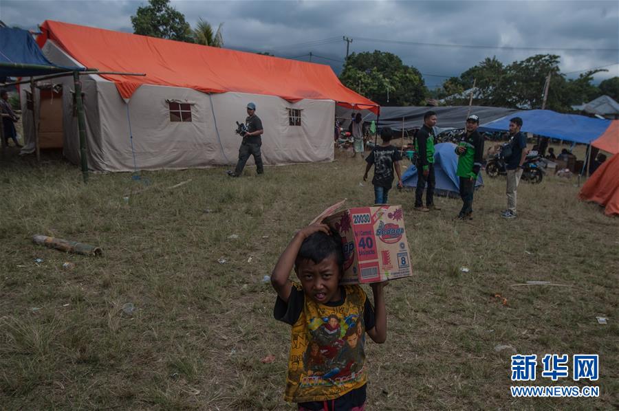 7月31日,在印度尼西亚龙目岛,一名男孩领取救援物资。 龙目岛29日发生6.4级地震。印尼抗灾署公布的数据显示,截至31日早上,地震已造成16人死亡、228人重伤、127人轻伤、1454座建筑物损毁,5141名当地居民被撤离。 新华社发(维里·萨诺弗里摄)