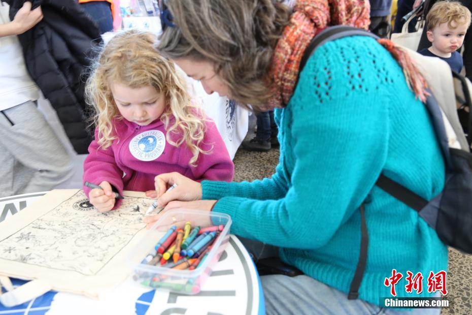8月4日,为期4天的澳大利亚南极节迎来公众开放日,展示南极科学考察各种装备。图为一对母女用画笔画出她们心中的南极。 中新社记者 陶社兰 摄