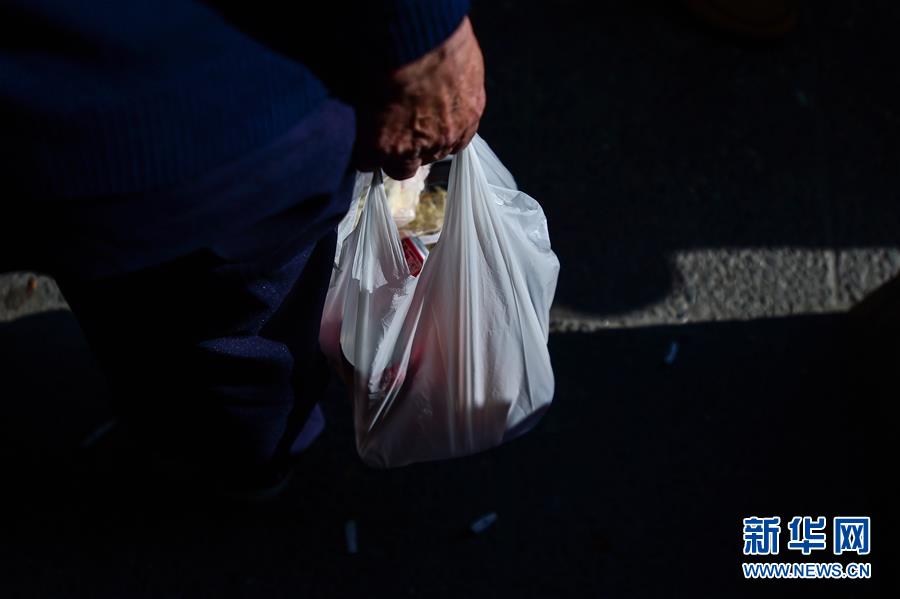 8月3日,在智利首都圣地亚哥街头,一名男子手提塑料袋。 新华社发(豪尔赫·比列加斯摄)
