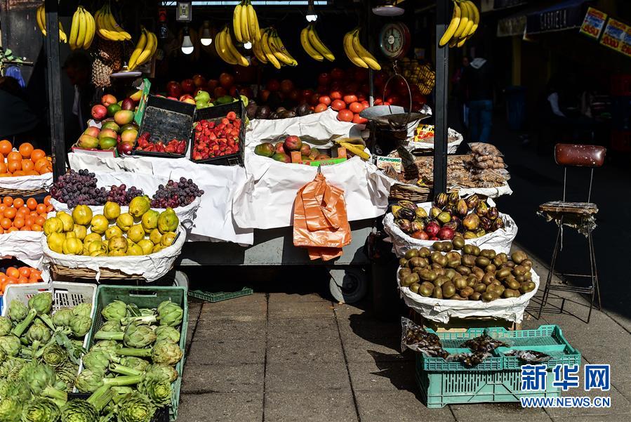 8月3日,在智利首都圣地亚哥,街头水果摊位边挂着塑料袋。 新华社发(豪尔赫·比列加斯摄)