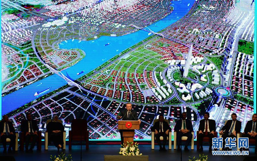 8月3日,在土耳其安卡拉,土耳其总统埃尔多安(中)在总统府发表演讲。 新华社发(穆斯塔法·卡亚摄)