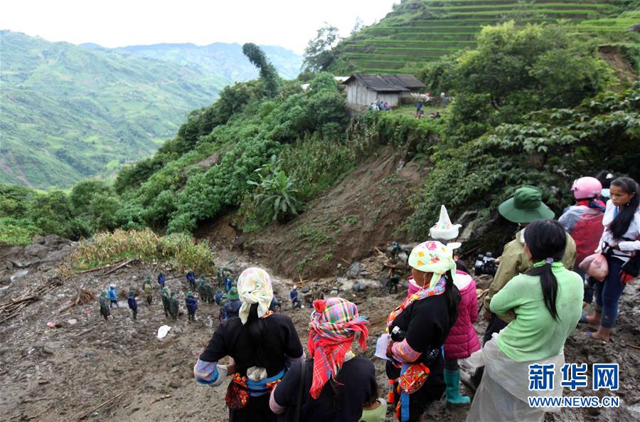 8月4日,在越南北部莱州省,人们聚集在一处山体滑坡现场。 据越通社4日报道,越南北部莱州省的强降雨引发山体滑坡,已造成6人死亡、6人失踪,3人受伤。 新华社/越通社