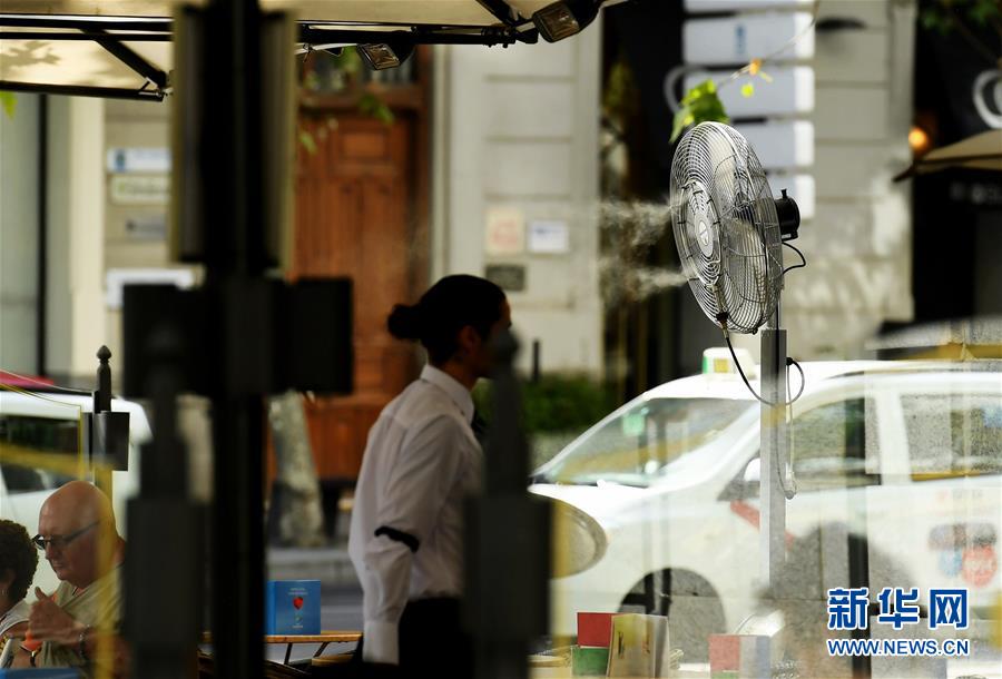 这是8月4日在西班牙马德里一家餐厅拍摄的带喷雾的电风扇。 近日,西班牙多地出现高温酷暑天气。 新华社记者郭求达摄