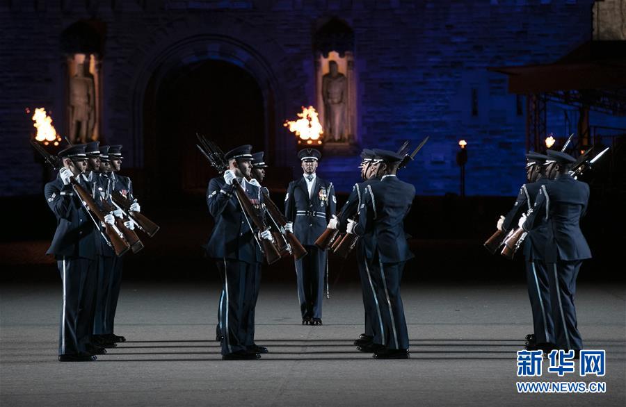 8月4日,在英国爱丁堡,军人在爱丁堡城堡前表演。