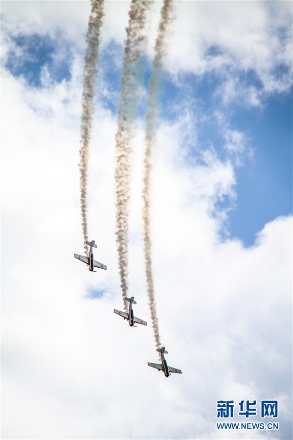 8月5日,在波兰东北部的吉日茨科,飞行表演队在马祖里航展上表演。当日,一年一度的马祖里航展在波兰东北部城市吉日茨科闭幕,精彩纷呈的飞行表演吸引了众多游客前来观看。新华社记者 陈序 摄