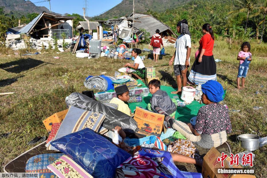 图为龙目岛的民众在户外开阔地避险,他们的房屋在地震中倒塌。