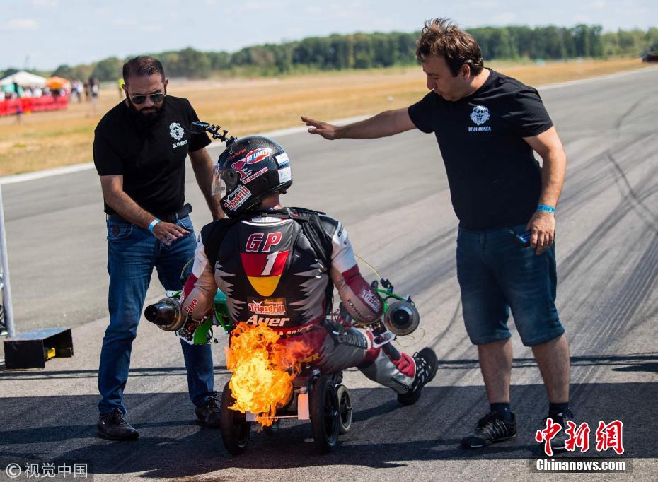 在比赛过程中,由于喷气设备出现故障,Dirk Auer一度火烧屁股。 图片来源:视觉中国