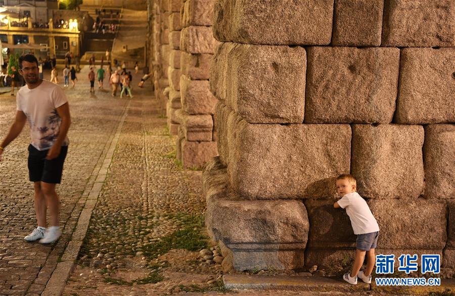 8月5日,在西班牙塞哥维亚,一名小男孩和爸爸在古罗马输水道下面捉迷藏。建于公元1世纪的古罗马输水道是西班牙小城塞哥维亚的象征,也是世界文化遗产。新华社记者 郭求达 摄