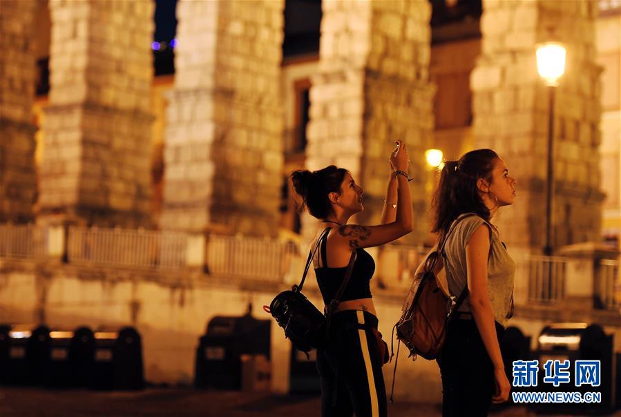 8月5日,在西班牙塞哥维亚,一名游客给古罗马输水道拍照。建于公元1世纪的古罗马输水道是西班牙小城塞哥维亚的象征,也是世界文化遗产。新华社记者 郭求达 摄