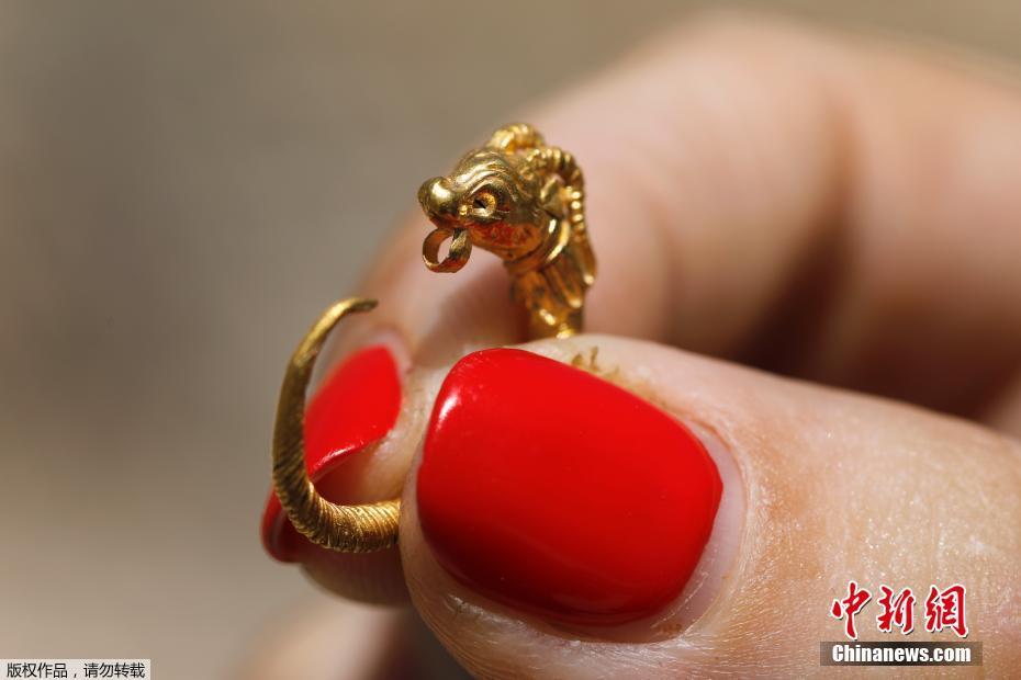 当地时间2018年8月8日,在东耶路撒冷大卫城的考古遗址上发现的一枚据称已有2000多年历史的金耳环。这枚金耳环上的图案像有角的动物,可以追溯到公元前2-3世纪。
