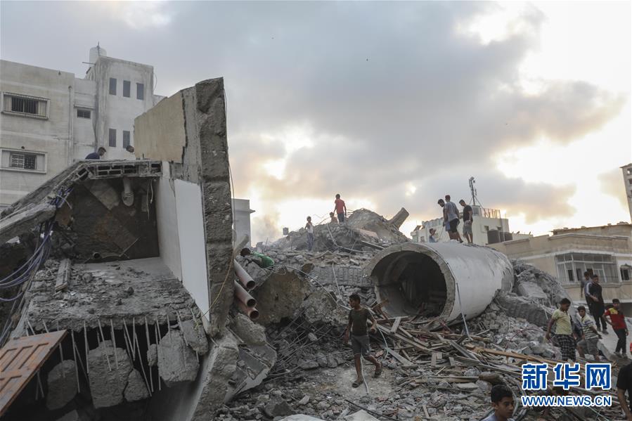 8月9日,在加沙城西部,巴勒斯坦人查看一处在以色列战机轰炸中倒塌的楼房。