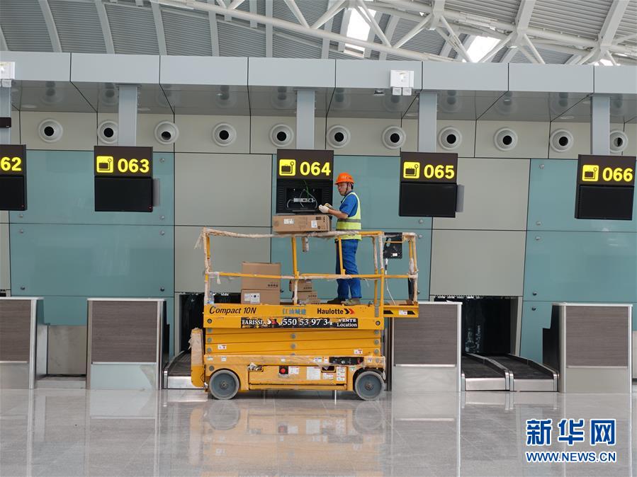 8月10日,中国工人在即将完工交付的阿尔及利亚阿尔及尔新机场旅客出发大厅安装设备。