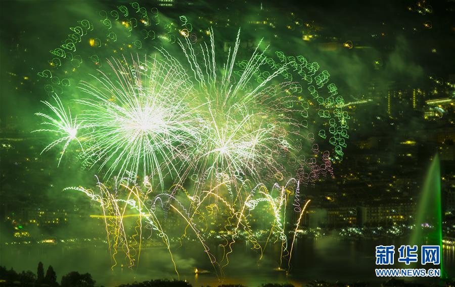 8月11日,在瑞士日内瓦,绚烂烟花绽放在莱蒙湖上空。 新华社记者徐金泉摄
