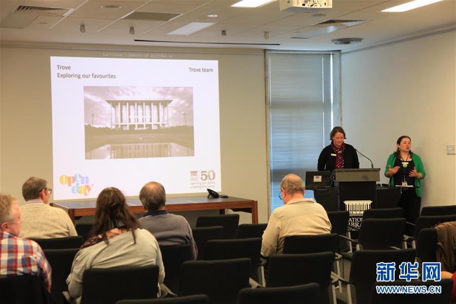 8月12日,在澳大利亚堪培拉,志愿者在国家图书馆内为游客讲解。 12日,澳大利亚举行纪念国家图书馆落成50周年的开放日活动。坐落在堪培拉格里芬湖边的国家图书馆共7层,于1968年落成,是堪培拉的标志性建筑之一。它是澳大利亚最大的参考(非借阅)图书馆。据了解,国家图书馆馆藏丰富,有超过300万册图书和60万张照片,还有报纸、杂志、手稿等藏品。 新华社发(潘翔越摄)