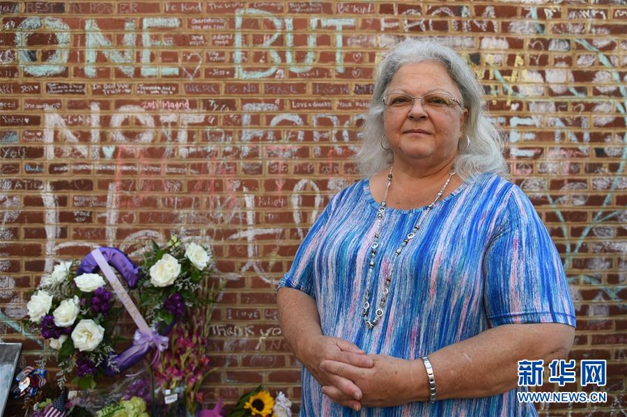 8月10日,在美国弗吉尼亚州夏洛茨维尔,暴力事件受害者的母亲在女儿遇难地点进行悼念。 2017年8月12日,美国夏洛茨维尔发生暴力事件,一名白人至上主义者驾车冲撞抗议者,造成一死多伤。 新华社记者杨承霖摄
