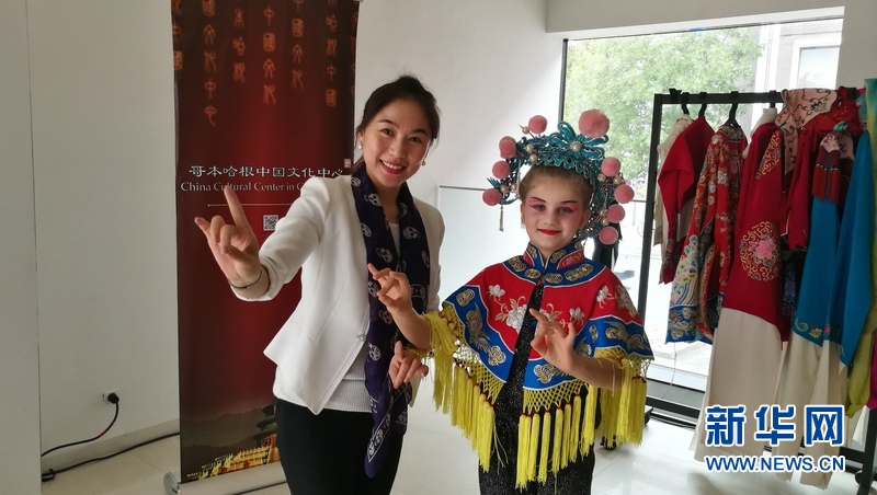 中国黑龙江省京剧团演员为丹麦小粉丝讲授京剧表演的动作。新华网发(张力摄)