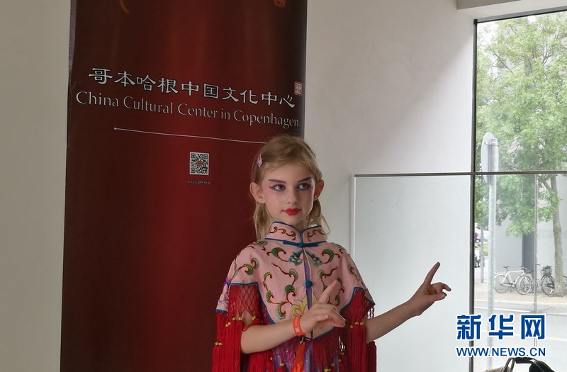 丹麦小粉丝展示刚学会的京剧表演动作。新华网发(张力摄)