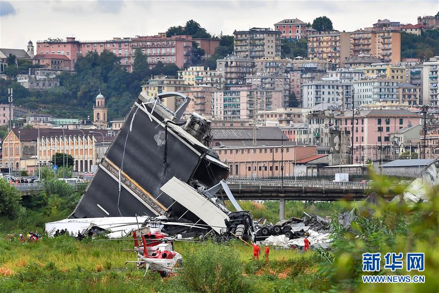 这是8月14日在意大利北部热那亚地区拍摄的大桥垮塌现场。 新华社发(阿尔贝托·林格里亚摄)